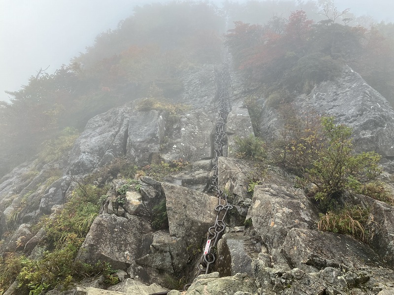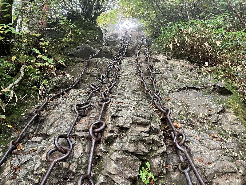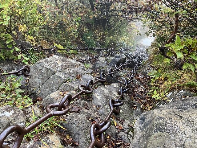 左は下り専用の鎖ですが、だれもいなかったので両方の鎖を見ながら登りやすいほうを選んで登りました。このタイプの鎖、はじめてのタイプで握りづらかったですが、輪っかに足を掛けられるのはよかった。足の大きい人は輪っかに入らないと思います。