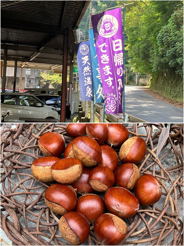 バス停で残りのお弁当を食べていると、近所のおじちゃんが前をとおって山に入っていきました。少しすると栗をとっておりてきました。「わぁ、きれいな栗ですね。写真を撮ってもいいですか?」 おじちゃん、撮影用にカゴまで持ってきてくれました。パチリ 頂上山荘の米は信者さんたちが神社に奉納したお米だとか、白石旅館は料理や設備(トイレ)も頑張って生き残ったなどいろいろお話してくれました。おじちゃんの伊予弁?が耳に心地よい。