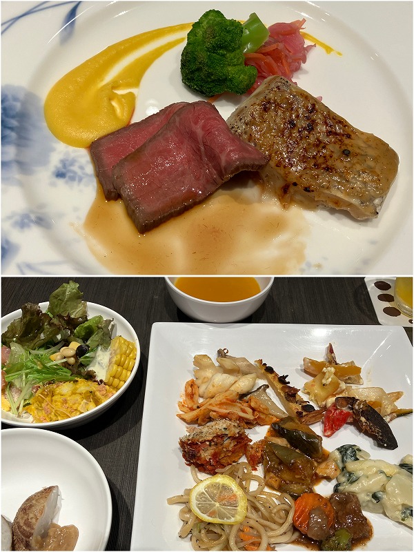 ビュッフェではないメインのお料理、伊予牛と愛媛産真鯛。お肉がうれしくて写真を撮る前に一切れ食べてしまいました。左上の黄色いのはマスタードではなく、サツマイモ?のマッシュポテト、たぶん。