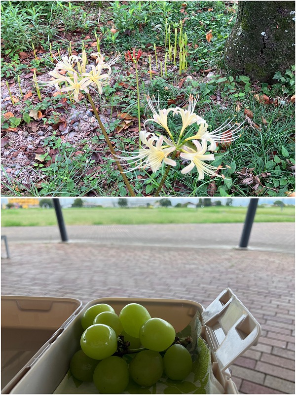 公園内の休憩所。おやつはふるさと納税でもらったシャインマスカット。今年はずいぶんと甘い。ふるさと納税のポイント付与は今月いっぱいまで。もう申し込み済です。