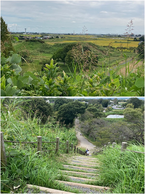 丸墓山山頂からお隣さんの稲荷山古墳が見えます。こうしてみると前方後円墳の形がよくわかります。