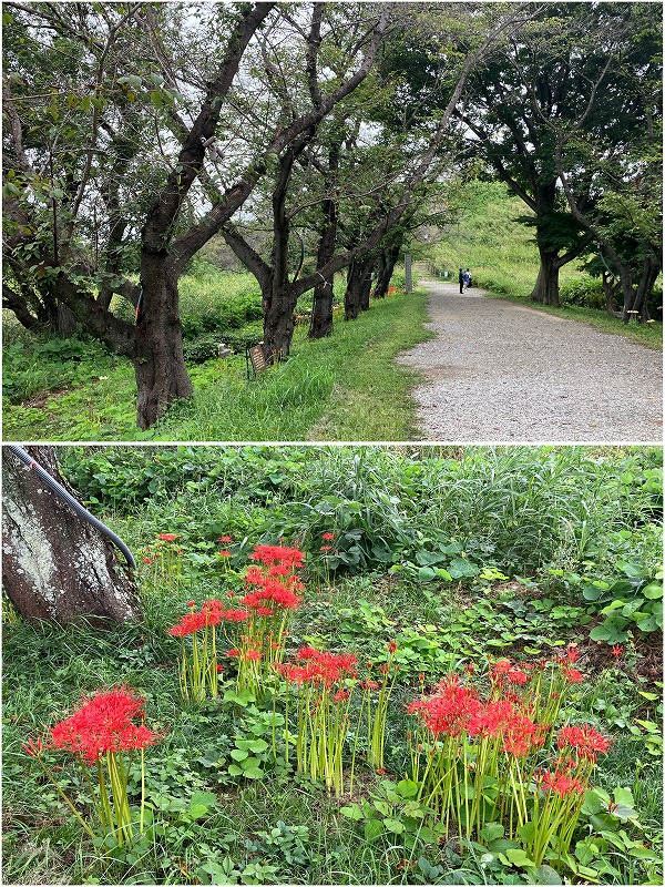 堤の桜並木の下に彼岸花。