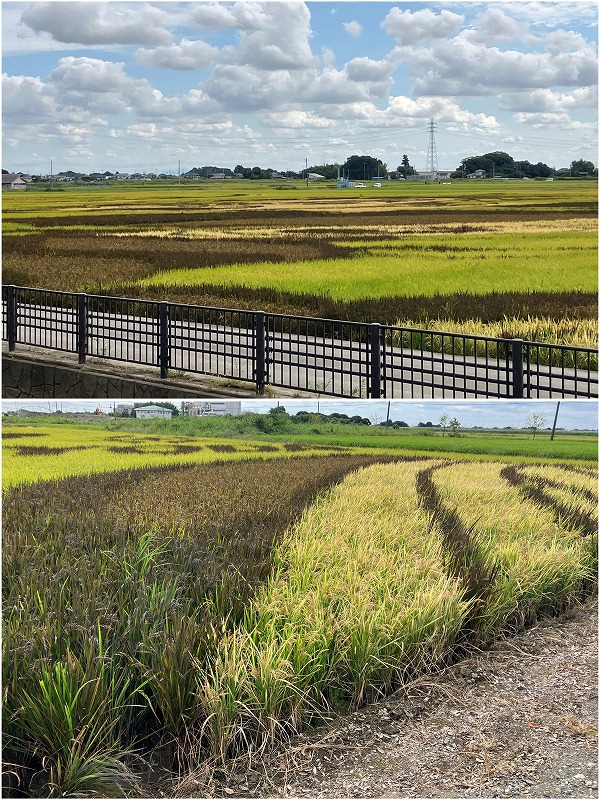下におりて田んぼアートの近くへ。奥の黄色の稲が炭治郎の顔部分です。